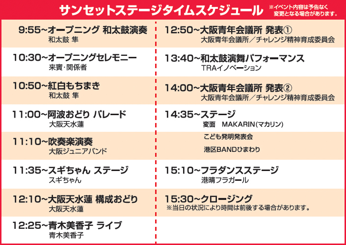 海が見渡せるステージでは、今年も内容もりだくさん。吹奏楽や和太鼓、フラダンス、今年は初参加の高知よさこい等、今年も多数のパフォーマンスは必見です!和太鼓演奏と共にメインステージから紅白もちまきを行います。