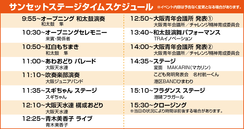 第17回MINATO天保山まつりは、今年も昨年同様、一般社団法人大阪青年会議所と共催し、大阪・関西万博期間内2025年10月4日(土)に開催します。